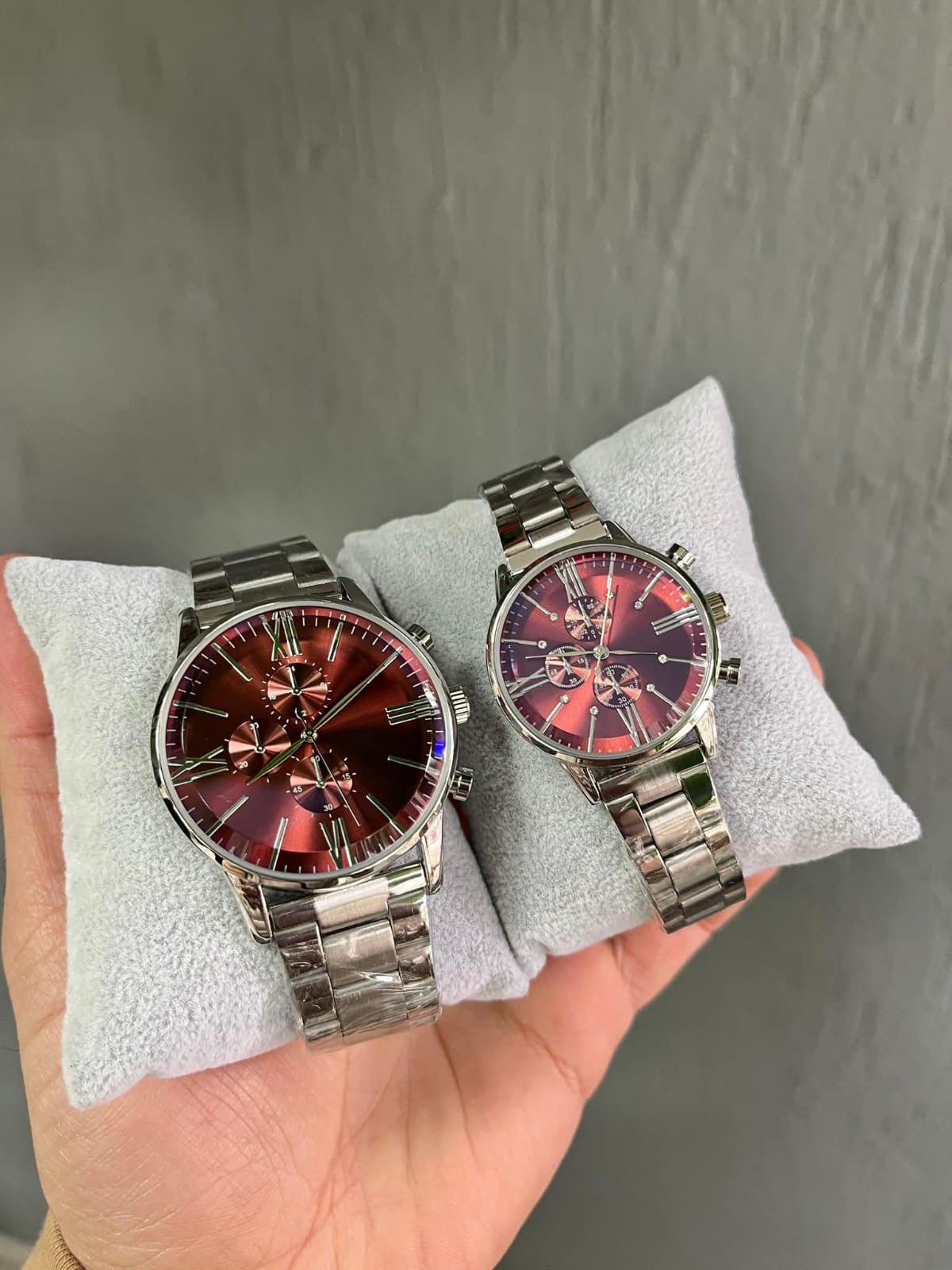 YAZISIZ ARMANI DIŞI GÜMÜŞ İÇİ KIRMIZI ÇİFT SAAT (ERKEK+BAYAN)